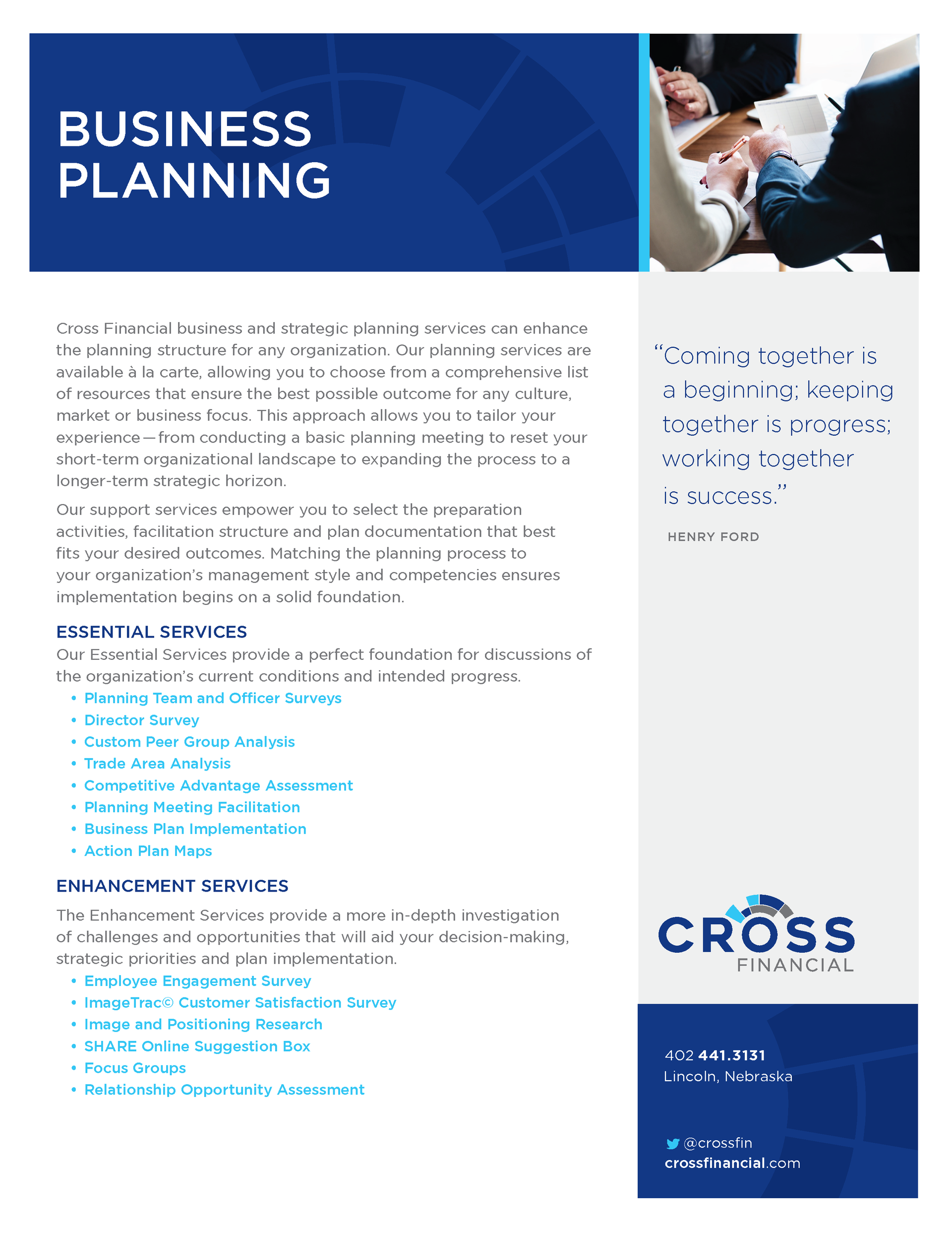 No matter what stage of development your institution has reached, Cross Financial can help you grow and achieve success through proven programs to create highly functional strategic plans.