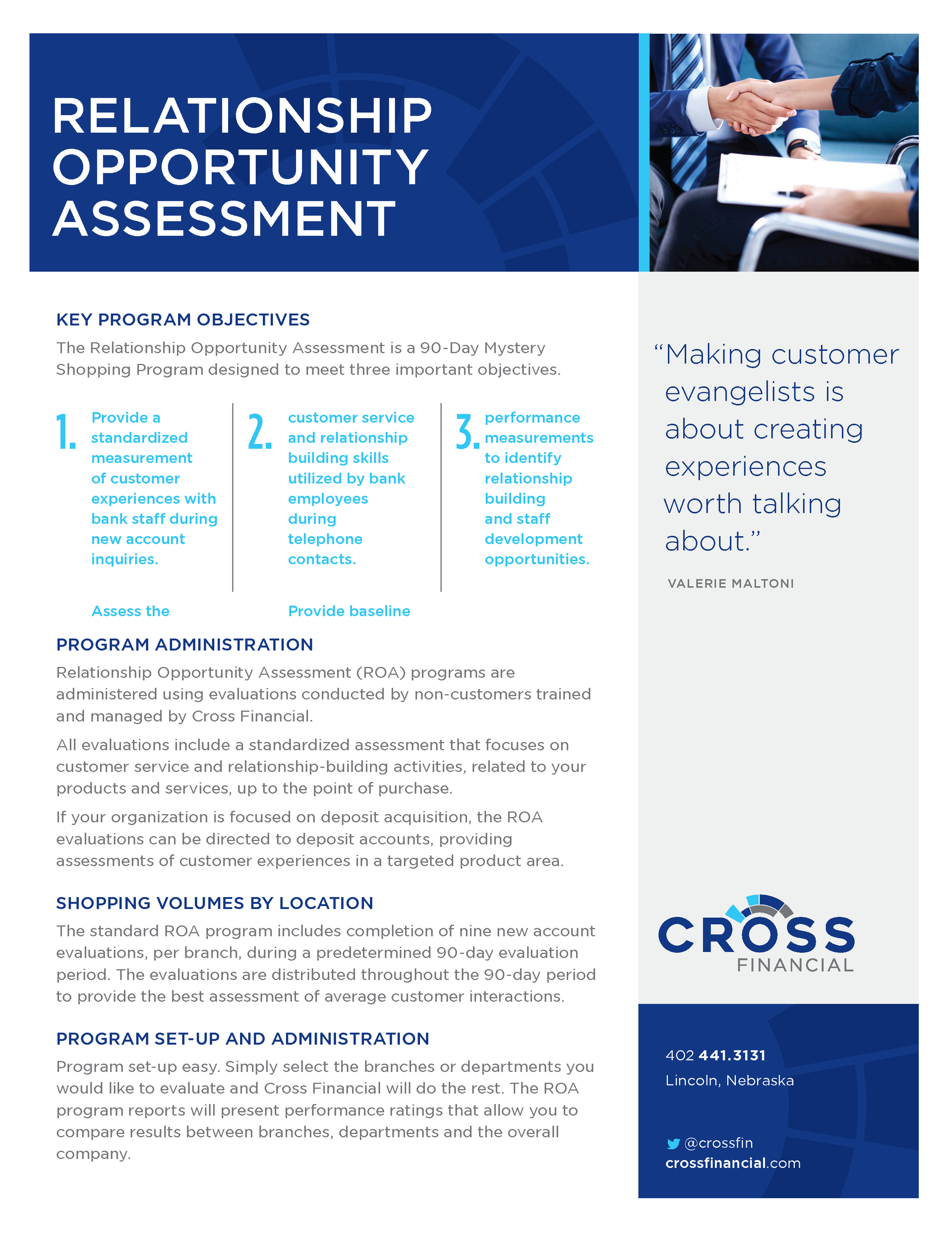 The Relationship Opportunity Assessment is a 90-day Mystery Shopping Program designed to meet three critical objectives.